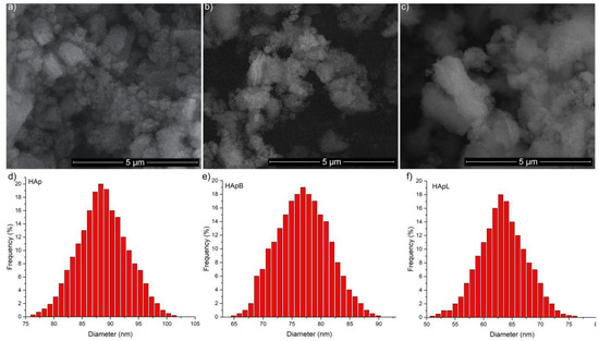 The morphology of the newly developed materials based on HAp and basil and lavender EOs (HApB and HApL) were studied using SEM. The influence of basil and lavender EOs on the size of HAp nanoparticles is presented in Figure 2a–c. The surface morphology did not change after the EO adsorption on the surface of the HAp nanoparticles. From the Scanning Electron Microscopy (SEM) images of the samples, the average size of the particles were determined by counting the number of particles (around 200). The particle distribution of HAp, HApB and HApL is presented in Figure 2d–f.