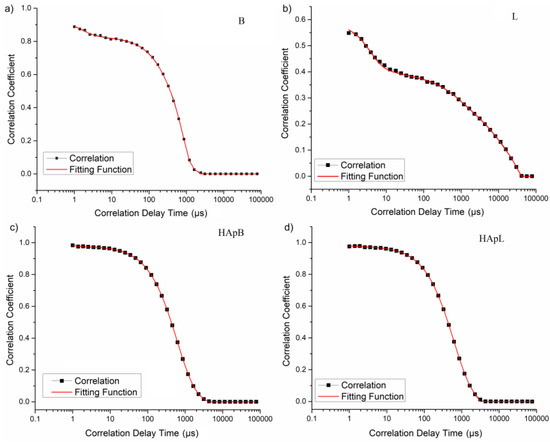 Experimental (markers) and fitted (red line) autocorrelation function obtained with DLS experiments for B (a); L (b); HApB (c) and HApL (d) samples.