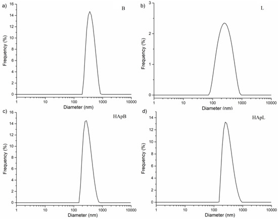 Particle size distributions of basil B (a); L (b); HApB (c) and HApL (d) obtained by fitting the experimental autocorrelation function.