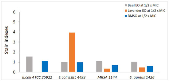 Stain indexes for each tested strain. The stain index is the ratio of the intensity of fluorescence measured in the FITC channel (530/30 nm), of bacteria treated with plant EO and DMSO respectively to that of untreated cells.