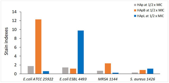 Stain indexes for each tested strain. The stain index is the ratio of the intensity of fluorescence measured in the FITC channel (530/30 nm), of bacteria treated with HAp, HApB and HApL to that of untreated cells.