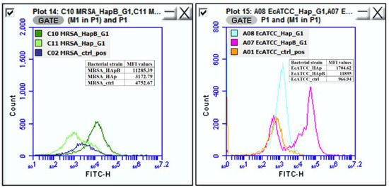 The flow cytometry (FCM)measurements were carried out for interrogation of the membrane potential of microbial cells treated with basil and lavender Eos, and the newly developed materials respectively, at ½ × MICs, using oxonol DiBAC4(3), as an indicator for membrane depolarization. The dye accumulates in the cytoplasm of depolarized bacteria and binds to intracellular proteins or membranes, thus resulting in an enhanced green fluorescence [70].