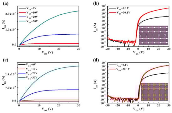 The representative output characteristic curves of amorphous silicon–tin oxide thin-film transistors (a-STO TFTs) with different source/drain (S/D) electrodes: (a) ITO and (c) Mo. The corresponding transfer characteristic curves with (b) ITO and (d) Mo.