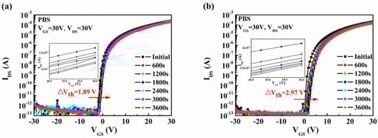 At last, the stabilities of a-STO TFTs with ITO and Mo were investigated by positive gate bias stress (PBS), as shown in Figure 5. The devices were stressed under the condition VGS = VDS = 30 V, which was applied for 3600 s. In the case of PBS stability, the TFT with ITO contact (∆Vth = 1.89 V) exhibited a more stable behavior than that with Mo contact (∆Vth = 2.97 V). The reason for the positive shifts of Vth is generally the trapping of electrons at the gate insulator–semiconductor interface. Interestingly, the on-current of both devices decreased as the time increased. This, again, implied that the generation of the local defect states near the electrode, resulting in the formation of a potential barrier, could block the injection of electrons from the electrode.