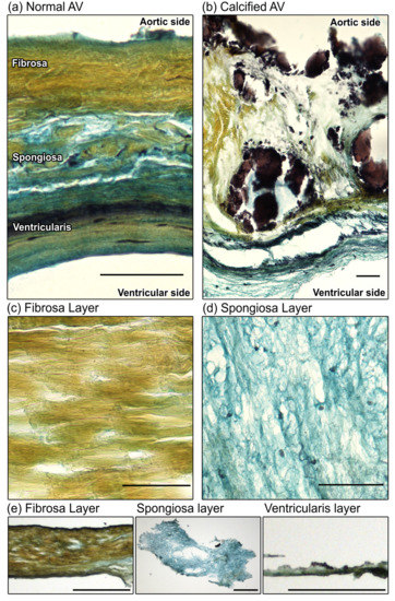 Movat’s pentachrome staining of structural organization in a circumferential cross-section of a human AV leaflet. Yellow = collagen, blue = glycosaminoglycans (GAGs), black = elastin, dark brown/black = calcification: (a) Tri-layered arrangement of the fibrosa (collagen-rich), spongiosa (GAG-rich), and ventricularis (elastin-rich) layers in a healthy leaflet; (b) Disruption of the leaflet layers by calcifications (black) and fibrosis (yellow regions) in CAVD; (c,d) Staining of collagen in the dissected fibrosa layer and GAGs in the dissected spongiosa layer confirmed distinct layer separation; scale bar = 50 μm; (e) Low-magnification images of microdissected fibrosa, spongiosa, and ventricularis layers; scale bar = 500 µm.
