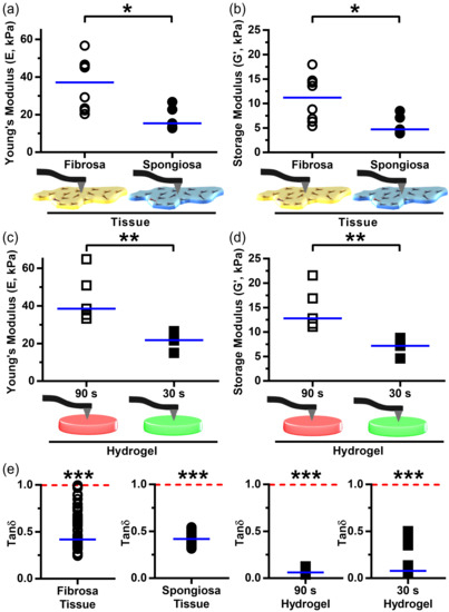 Nanoindentation data are presented as the median value per tissue sample, with each data point representing nine nanoindentation measurements per sample. Other quantitative data are presented as mean ± standard error. Two-tailed, one-sample t-tests were used to compare G′′/G′ values vs. the theoretical value of 1, Student’s t-tests were performed for two-group comparisons, and one-way or two-way ANOVA with Tukey’s post-hoc HSD test were used as appropriate to evaluate statistically significant differences in multiple group comparisons (R or GraphPad Prism 7, GraphPad Software, La Jolla, CA, USA).