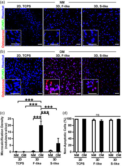 Fibrosa-like hydrogels preferentially induced production of osteogenic microcalcification by VICs. Red = NIRF Osteosense 680 imaging agent (nano- and microcalcifications), green = TUNEL apoptosis assay, blue = Hoechst nuclear stain: (a) VICs isolated from non-diseased human AV did not undergo calcification when cultured in NM on/in either 2D tissue culture polystyrene (TCPS), 3D fibrosa-like (F-like) hydrogels, or 3D spongiosa-like (S-like) hydrogels (representative images); (b,c) Importantly, under OM treatment this naïve VIC population developed significant production of microcalcification only in 3D F-like hydrogels that mimic the biomechanics of the disease-prone layer of the native tissue. OM treatment did not induce significant microcalcification on 2D TCPS or in 3D S-like hydrogels. (d) Apoptosis was negligible and unchanged across all conditions, confirming that apoptotic cell death was not the source of preferential calcification in OM-treated F-like hydrogels. Mean + SEM; *** p < 0.001; n = 3 samples per condition (3 images per sample); scale bar = 50 μm.