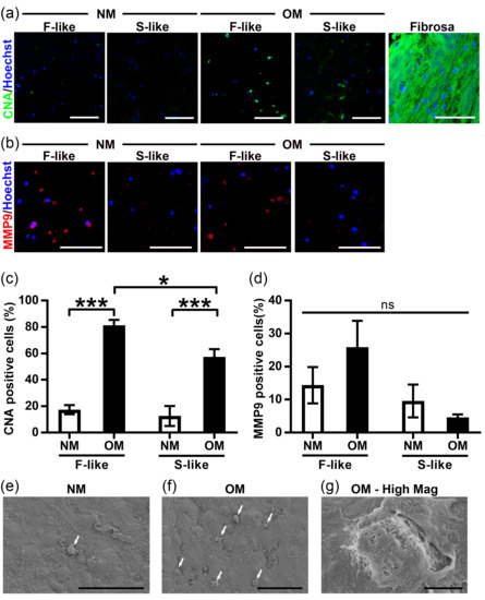 OM stimulation induced VIC pathogenesis in 3D-bioprinted hydrogels: (a,c) VICs isolated from non-diseased human AV and exposed to OM (and not NM) for 14 days stimulated production of collagen, as shown by representative images of collagen-binding probe (CNA35) fluorescence; (b,d) OM-treated F-like VICs trended towards increased expression of the ECM-degrading collagenase enzyme MMP-9 (representative immunofluorescence images). Mean ± SEM; * p < 0.05, *** p < 0.001; n = three samples per condition (three images per sample); scale bar = 200 µm; (e–g) SEM of hydrogels showed that OM treatment drove formation of in vivo-like microcalcific nodules (white arrows), scale bar = 100 µm (e,f) or 10 µm (g).