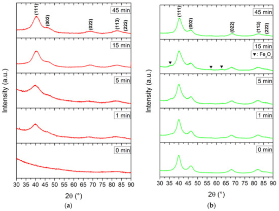 Diffraction patterns of the nanoparticles retrieved at 0, 1, 5, 15, and 45 min after the color transition of the reaction medium benzyl alcohol (a) and benzylamine (b).