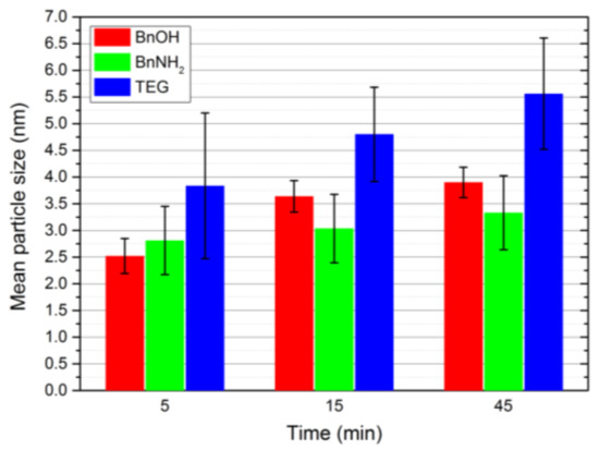 During the syntheses, we observed a color transition from a reddish solution into the characteristic dark brownish medium, which is associated with particle growth. Henceforth, we started taking samples at 0, 1, 5, 15, and 45 min of reaction. The actual formation of the nanoparticles already occurred prior to the color shift, but is difficult to be precisely specified due to very low initial quantities of retrievable nanoparticles. The color transition of the reference BnOBn route, as also published earlier [40], was reached at a temperature of 175 °C approximately 45 min after complete dissolution of the precursors (Table A1). All three alternative synthetic routes showed the color shift around 150 °C and, thus, are about 15 min faster as compared to the reference synthesis.