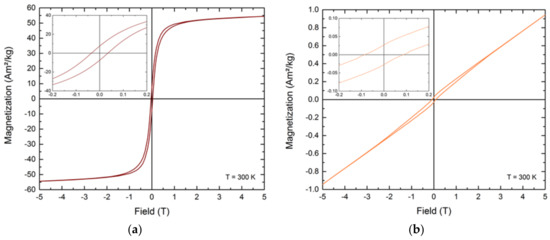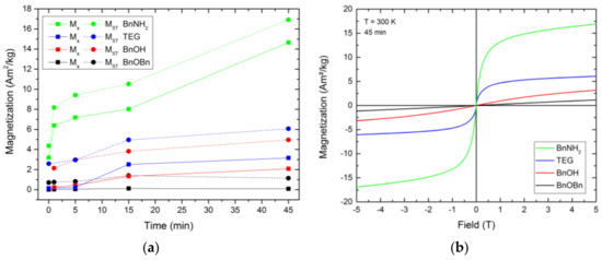 All as-prepared fcc-FePt nanoparticles showed superparamagnetic behavior (Figure 6), which can be ascribed to their ferromagnetic iron atoms and small particle sizes below the critical diameter, where only one single magnetic domain exists in one particle [41,42]. In the literature, the maximum magnetization value is often used to describe the saturation magnetization Ms of the FePt nanoparticles. With our measurements, no saturation was reached with higher magnetic field strength within the measurement range. Instead, we observed a slightly increasing magnetization with the rising magnetic field, which we assume is evoked by an additional paramagnetic effect caused by the platinum atoms. Thus, we subtracted the paramagnetic influence using a linear fit on the magnetization values at 4 and 5 T and defined the intersection of this linear fit curve with the ordinate as the saturation magnetization. However, to show the highest measured magnetizations of the prepared particles and to allow comparison with previously published data, we also display the magnetization values at 5 T, M5T.