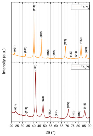 Powder X-ray diffraction (PXRD) was carried out on vacuum-dried and annealed FePt samples to determine the crystal structure as well as crystallite size of the ordered L10 and L12 phases using Cu Kα radiation (Empyrean Cu LEF HR goniometer, Almelo, Netherlands) on a Si sample holder in a range between 20 and 90° 2θ with a step size of 0.05° (Empyrean series 2, PANalytical PIXcel-3D detector, Almelo, The Netherlands).