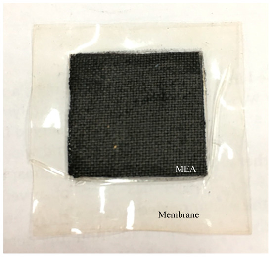 Finally, to get the membrane assembly (MEA), two sheets of sublayer ink-coated GDL were put on both sides of catalyst-coated membrane and then pressed by a compression mold (LP20, Labtech, Tampa, FL, USA) at 137 °C with a pressure of 65 kgf/cm2 for 2.5 min. The external feature of the obtained MEA is exhibited in Figure 1.