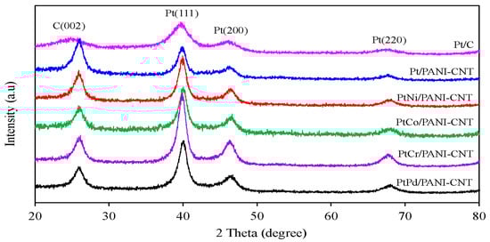 As summarized in Table 1, the in-plane electrical conductivities of the Pt/PANI-CNT and PtM/PANI-CNT electrodes in air at 65% humidity were nearly the same, which were higher than the commercial Pt/C catalyst. This suggested that the PANI-CNT support exhibited a higher electrical conductivity than the commercial carbon support and the formation of the respective PtM alloys did not significantly affect the electrical conductivity of PtM/PANI-CNT electrode. With respect to the ESA of all the prepared catalysts, the ESA of Pt/PANI-CNT was slightly lower than that of the commercial Pt/C catalyst (Table 1), probably due to its large particle size. Although the PtM/PANI-CNT catalysts had almost similar particle sizes, they exhibited a lower ESA than the Pt/PANI-CNT catalyst. This might be due to the presence of a lower quantity of Pt in all the PtM/PANI-CNT catalysts (~71.3 to 74.63% Pt) compared to in the Pt/PANI-CNT catalyst (100% Pt). For the PtM/PANI-CNT catalysts, their ESA was ranked in the order of PtPd/PANI-CNT > PtCr/PANI-CNT > PtCo/PANI-CNT > PtNi/PANI-CNT, which probably reflects the effect of the quantitative existence of the active single plane of Pt. That is, due to the nature of the method used to estimate the ESA (H2 adsorption method), the atomic hydrogen will adsorb only on the single crystal planes of Pt (100, 110 or 111) [45]. However, from the XRD analysis, only the Pt(111) plane was found in the prepared samples, suggesting that the addition of Pd facilitated the formation of a single crystal plane of Pt (111) on the PANI-CNT more than the addition of Ni, Co or Cr.