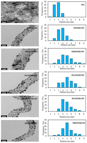 The average crystallite size of all the prepared catalysts was estimated from Scherrer’s equation [33]. The crystallite size of Pt in the Pt/PANI-CNT catalyst was larger than that in the Pt/C catalyst (Table 1), consistent with the particle sizes observed in the TEM analysis (Figure 3). This suggested a slight agglomeration of Pt particles on the PANI-CNT support, which was probably because of the different quantity of oxygen containing surface groups on surface of PANI-CNT in comparison to that on the carbon. A high density of oxygen containing surface groups can enhance an increased catalyst crystallite and/or particle size by diminishing the number of surface basic sites, which are the centers for the strong adsorption of PtCl62− [34], decreasing the metal-support interaction [35] and hindering the Pt precursor reduction [36]. The particle sizes of all PtM on the PANI-CNT support were nearly the same (Table 1), suggesting that alloying of Pt with different M did not induce an agglomeration of catalyst particles on the PANI-CNT surface.