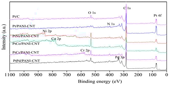 From the XRD patterns, the characteristic peaks of each respective M did not appear, probably due to their presence in small quantities or in amorphous forms. Thus, XPS and SEM-EDX analyses were employed to detect the presence of these metal elements. As demonstrated in Figure 4, besides the presence of the basic elements, including C 1s (from support), O 1s (from the surface functional groups of the support), N 1s (from the amine group of PANI) and Pt 4f, in all samples in the survey XPS spectra, the signals of Ni 2p, Co 2p, Cr 2p and Pd 3d were, respectively, observed in the PtNi/PANI-CNT, PtCo/PANI-CNT, PtCr/PANI-CNT and PtPd/PANI-CNT catalysts. This evidenced the presence of the respective M in the PtM/PANI-CNT catalysts.