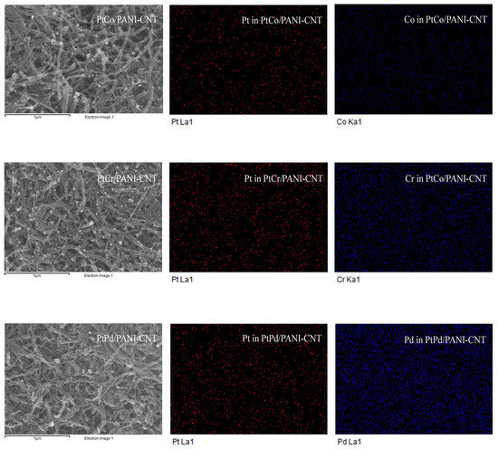 The appearance of the dispersed Pt and M metals along the support surface was clearly observed in the respective SEM-EDX analysis, as exhibited in Figure 5, in which both Pt and M were uniformly distributed on the support surface. This was due to the presence of the N-group on the PANI surface that could bond directly with metal ions [27]. The quantitative metal dispersion along the support was determined by polynomial equations [37], as shown in Equations (3)–(5):