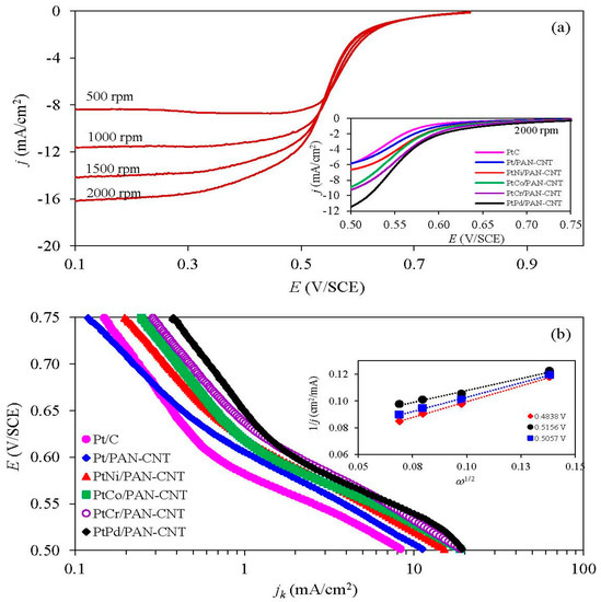 The ORR activity of all the catalysts was initially investigated using a RDE in O2-saturated 0.5 M H2SO4 at different rotation rates of 500 rpm to 2000 rpm. A well-defined current density-potential curve was observed (Figure 7a), including: (i) a kinetics-controlled region (+0.80 V to +0.62 V); (ii) an intermediate region of mixed control (+0.62 V to +0.52 V); and (iii) a diffusion-controlled region (+0.52 V to +0.20 V). At the same rotation rate, the onset potential of the Pt/PANI-CNT and all PtM/PANI-CNT catalysts were shifted to a higher potential compared to the commercial Pt/C catalyst (inset of Figure 7a), and they could be ranked in the order of PtPd/PANI-CNT > PtCr/PANI-CNT > PtCo/PANI-CNT > PtNi/PANI-CNT > Pt/PANI-CNT, presumably indicating a direct trend in the ORR activity.