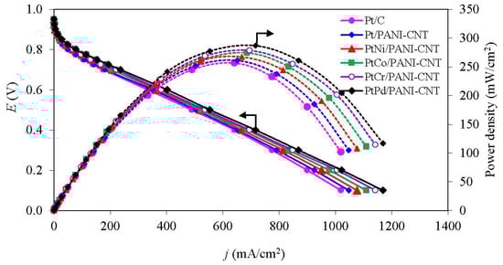 The activity of all the PtM/PANI-CNT catalysts was also evaluated in a PEM fuel cell under a H2/O2 atmosphere at low temperature of 60 °C and ambient pressure. The open circuit voltage (OCV) of all the prepared catalysts was similar (Figure 8), ranging 0.949–0.963 V. This suggested that the different PtM alloy catalysts did not markedly affect the OCV of the single cell. During the activation-controlled region (<100 mA/cm2), all PtM/PANI-CNT catalysts provided a higher current density at 0.9 V (j0.9V) than the Pt/PANI-CNT and commercial Pt/C catalyst (Table 3). This is probably because the presence of the M in the PtM alloy catalyst modifies the geometric (Pt-Pt interatomic distance) and electronic (d-band vacancy) structure of the Pt catalyst. The j0.9V of all PtM/PANI-CNT catalysts was ranked in the order of PtPd/PANI-CNT > PtCr/PANI-CNT > PtCo/PANI-CNT > PtNi/PANI-CNT, consistent with the ESA trends (Table 2) and the amount of Pt0 observed by XPS analysis (Table 2), resulting in a high oxygen adsorption on the catalyst surface [47].