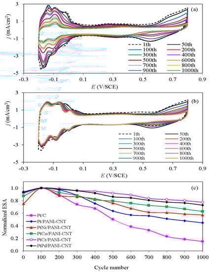 The stability of the prepared Pt/PANI-CNT and PtM/PANI-CNT catalysts and the commercial Pt/C one was evaluated using repetitive CV in N2-saturated 0.5 M H2SO4 over a potential range of −0.2 and +0.8 V/SCE at a scan rate of 20 mV/s. A representative repetitive CV trace is shown in Figure 9a,b, where a well-defined hydrogen adsorption/desorption peak was observed. The quantitative ESA of the catalysts was then determined via Equation (1) at a particular CV cycle. In terms of the normalized ESA, the Pt/PANI-CNT catalyst exhibited a lower ESA loss than the commercial Pt/C catalyst, suggesting its higher stability. This is because the conductive PANI can help to reconfigure the catalyst-support interaction [27] and sometimes partially hinders the exposure of the support with the generated H+, resulting in a low corrosion of the catalyst support. All PtM/PANI-CNT catalysts exhibited a smaller ESA loss than the Pt/PANI-CNT catalyst, probably due to a low level of Pt aggregation during alloy formation. Among all the PtM/PANI-CNT catalysts, the addition of Cr enhanced the Pt catalyst stability more than the addition of Ni, Co or Pd, consistent with the previously defined activity/stability level of the PtM alloys [49], in which Cr was classified as a stable metal once composited with Pt to form the PtCr alloy. This likely reflects that PtCr had an appropriate metallic-ordered state to resist the acid environment.