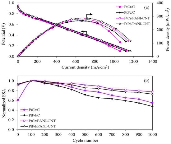 To confirm the activity and stability of the support materials, two types of Pt alloy (PtCr and PtPd) supported on the PANI-CNT and commercial carbon black (Vulcan XC-72) were tested comparatively. As shown in Figure 10, the PANI-CNT support provided a higher ORR activity and stability than the commercial carbon support, which could be attributed to the unique properties of multiwall CNTs in comparison with a carbon support, including an excellent electrical conductivity, high surface area, high chemical stability and high amount of mesopores, which resulted in a high metal dispersion and a good reactant flux in their tubular structure [50,51]. Therefore, the PANI/CNT is recommended to be used as the catalyst support instead of the commercial carbon for the use in a PEM fuel cell. According to all above results, although the PtCr/PANI-CNT catalyst exhibited a lower (4.98%) performance in the PEM fuel cell than PtPd/PANI-CNT, it exhibited a much lower (14.8%) ESA loss after 1000 cycles of repetitive CV. In addition, Cr is cheaper than Pd, and so PtCr/PANI-CNT is the recommended cathode catalyst for a PEM fuel cell.