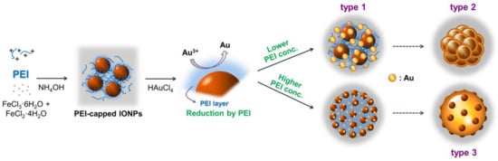To synthesize nanoparticles, metal ions must be reduced within a colloid, protecting against precipitation. Metal nanoparticles tend to agglomerate and form larger clusters, which is possibly overcome via the spontaneous adsorption of polymeric molecules onto the surface of particles [22]. In our previous study, ultra-small, polyethyleneimine (PEI)-capped IONPs were synthesized for MR imaging [23]. PEI is a cationic polymer with highly positive charges. The PEI adsorption layers on IONPs give a colloidal stability against agglomeration. Moreover, PEI molecules act as a stabilizer and reductant during the synthesis of AuNPs [24,25]. AuNPs can be produced in an aqueous PEI solution without a reducing agent such as NaBH4. Amino groups in PEI molecules function as proton acceptors/electron donors, reducing Au3+ to Au.