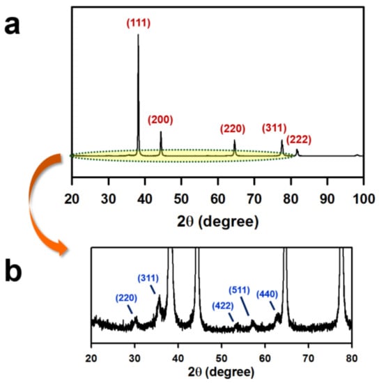 XRD patterns of the NanoIOGs for Au (a) and iron oxide (b) crystals. The diffraction patterns were almost identical for the NanoIOGs prepared with the PEI concentrations of 0.02, 0.05, and 0.08 wt. %.