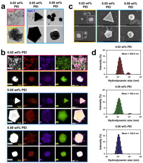 Through the entire procedure of NanoIOG synthesis, PEI was used as a polymeric active stabilizer (PAS), acting as a reductant for the synthesis of gold and a dispersant for nanoparticles and nanoclusters. Thus, the synthesis of NanoIOGs was significantly influenced by the concentration of PEI. When the IONPs prepared at the PEI concentration of 0.02 wt. % were used, seed-like AuNPs were produced around the IONPs. The resulting product is a mixture of IONPs and Au nanoseeds (type 1), as shown in the TEM images and EDX elemental mappings in Figure 3. The Au nanoseed formation around the IONPs is the key point in elucidating the production of alloy clusters of IONPs/Au crystals in this study. The AuNP seeds were produced adjacent to the IONPs, because most of Au ions could be reduced by the adsorption layers of PEI on the IONPs. The cloud-like aggregates of Au nanoseeds and IONPs mixture were found in the TEM images of type 1 (also shown in Figure S1), and they can be regarded as precursors of the alloy clusters of iron oxide and gold. Based on the nanoseed-assisted synthesis of Au crystals around the IONPs, the alloy clusters could be produced depending on PEI concentration. The aggregated alloy clusters of Au-coated IONPs (type 2 in Figure 1) were also found at 0.02 wt. % PEI. The coexistence of iron oxide and Au in a single cluster was confirmed via EDX mapping images for type 2 (Figure 3b), which had a core (IONPs)-shell (Au) structure, as shown in the SEM images (Figure 3c). With further reduction by PEI, the Au seeds grew to form Au crystal layers on the surfaces of IONPs, resulting in the core-shell alloy clusters. However, the growth of Au crystals was limited because of the relatively low concentration of PEI as a reducing agent. When the IONPs prepared at the higher PEI concentrations, such as 0.05 and 0.08 wt. %, were used, larger alloy clusters (type 3) were produced, as shown in Figure 1 and Figure 3b. Under these conditions, the nucleation and growth of Au seeds proceeded intensively via vigorous reduction by PEI. The iron oxide/Au alloy clusters produced with 0.05 wt. % PEI were mostly large and well-faceted, whereas those formed with 0.08 wt. % PEI were relatively small and nearly spheroidal, as shown in Figure 3a,c, indicating the dispersing effect of PEI on the size and shape of alloy cluster.