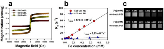 - Do, M.A.; Yoon, G.J.; Yeum, J.H.; Han, M.; Chang, Y.; Choi, J.H. Polyethyleneimine-mediated synthesis of superparamagnetic iron oxide nanoparticles with enhanced sensitivity in T2 magnetic resonance imaging. Colloid Surf. B-Biointerfaces 2014, 122, 752–759. [Google Scholar] [CrossRef] [PubMed]