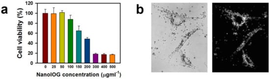 Relative viability of human fibroblast cells cultured with the NanoIOGs prepared with 0.08 wt. % PEI; the error bars indicate ±SD (n = 4) (a), and bright field (left) and DF (right) microscope images of human fibroblast cells cultured with the NanoIOGs prepared with the same PEI concentration (b).