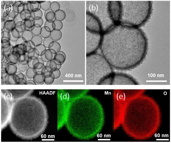 High- (a) and low-magnification (b) HRTEM images of hollow MnO2 nanospheres; (c) HAADF-STEM image of hollow MnO2 nanospheres. Elemental mapping of hollow MnO2 nanospheres: (d) Mn and (e) O.