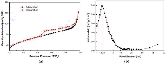 BET measurement of hollow MnO2 nanospheres. (a) Nitrogen adsorption/desorption isotherms of as-synthesized hollow MnO2 nanospheres; (b) the pore size distribution of hollow MnO2 nanospheres, as calculated using a BJH (Barrett-Joyner-Halenda) method.