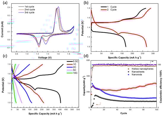 The electrochemical performance of hollow MnO2 nanospheres was evaluated in aqueous Zn-MnO2 batteries. The Zn-MnO2 cell was assembled with zinc foil as an anode and 1.0 M Zn(SO4)2 aqueous solution with 0.2 M MnSO4 as an electrolyte. Figure 5a shows the cyclic voltammetry scan results of the Zn-MnO2 cell with hollow MnO2 nanospheres as cathode materials. The sweep range was between 1.9 V and 0.8 V vs. Zn/Zn2+, and the sweep rate was 0.1 mV/s. During the first cycle, a low cathodic peak at around 1.36 V and a sharp cathodic peak at around 1.22 V were observed, while only one anodic peak at around 1.58 V was observed when sweeping back. In the following scan cycles, the cathodic peak at 1.36 V increased gradually, indicating an activation process of hollow MnO2 nanospheres during discharge. Figure 5b shows the typical galvanostatic discharge/charge profiles of the Zn-MnO2 cell at a 1 C rate. The discharge curve in first cycle exhibited a flat plateau at around 1.26 V, which is consist with the CV results. Two plateaus, ~1.38 V and ~1.26 V, were observed during the second discharge process, which are related to two distinct cathodic peaks in the second sweep of CV curves, indicating a two-step intercalation process of zinc ions into the birnessite structure. Upon charge process, two plateaus at ~1.50 V and ~1.58 V were observed. Previously, the two-step intercalation process was also observed in other Zn-MnO2 batteries based on birnessite-type materials [23,24]. The discharge capacity of hollow MnO2 nanospheres reached up to ~270 mAh g−1 at a 1 C rate.
