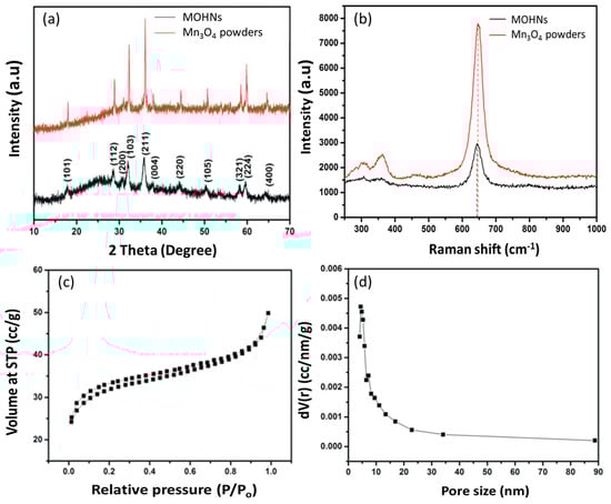 (a) The XRD patterns of the MOHNs and the Mn3O4 powders; (b) the Raman spectra of the MOHNs and the Mn3O4 powders; (c) the BET isotherm of the MOHNs; and (d) the pore size distribution of the MOHNs.