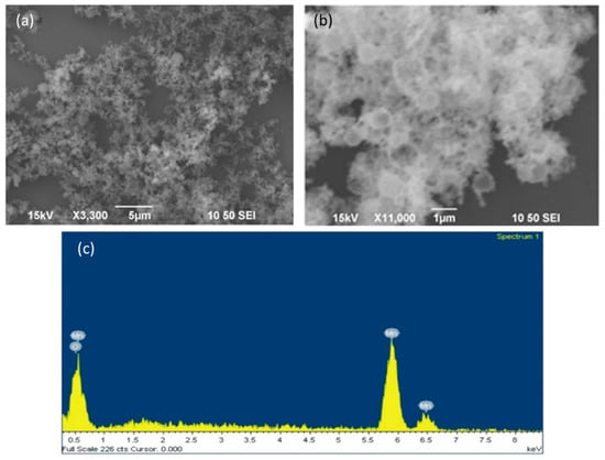 (a,b) the SEM images of the MOHNs; (c) the EDS spectrum of MOHNs. Figure 2a is reproduced with permission from [16]. Copyright IEEE, 2016.
