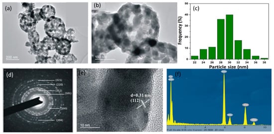 (a,b) the TEM images of the MOHNs; (c) the particle size distribution of Mn3O4 nanoparticles on the hollow nanocages of MOHNs; (d) the SAED pattern of the MOHNs; (e) the HRTEM image of the lattice fringe of the MOHNs; and (f) the EDS spectrum of MOHNs. Figure 3b is reproduced with permission from [16]. Copyright IEEE, 2016.