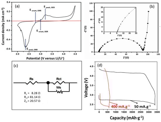 (a) The CV curve of MOHNs/KB cathode-based Li–O2 battery with LiTFSI/TEGDME as the electrolyte; (b) the electrochemical impedance spectrum (EIS) of the MOHNs/KB cathode-based Li–O2 battery. The inset is the enlarged portion of the EIS spectrum of the MOHNs/KB cathode-based Li–O2 battery in the range of 0–20 Ω; (c) the equivalent circuit model of the impedance spectrum of a MOHNs/KB cathode-based Li–O2 battery, and (d) the first discharge–charge curves of the MOHNs/KB cathode-based Li–O2 battery with the voltage between 2.4 and 4.4 V at a current density of 50 and 400 mA·g−1. Figure 4a,d are reproduced with permission from [16]. Copyright IEEE, 2016.