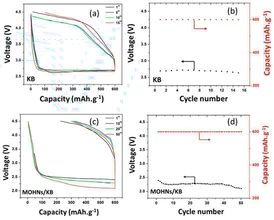 The galvanostatic discharge–charge profiles of the Li–O2 batteries with a KB cathode and a MOHNs/KB cathode are depicted in Figure 5a,b. The discharge voltage in both cases decreases till they reach a steady-state value. The difference between the open circuit voltage and steady-state voltage for the first discharge cycle, ∆Edischarge is 0.94 and 1.76 V for the MOHNs/KB and KB cathode-based Li–O2 batteries, respectively. The reduced overpotential is the result of the catalytic activity of the MOHNs [18,41]. Therefore, it can be safely concluded that the performance of the Li–O2 batteries depend heavily on the properties of the cathode.