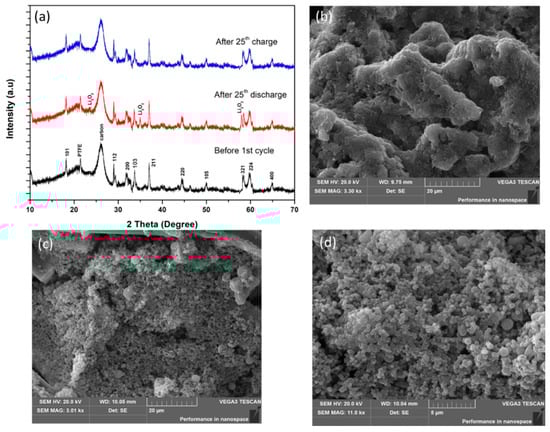 (a) The XRD patterns of the MOHNs/KB cathode before the cycle, after the 25th discharge cycle, and after the 25th recharge cycle; (b) the SEM image of the MOHNs/KB cathode after the 25th discharge; (c,d) the SEM image of the MOHNs/KB cathode after the 25th recharge.