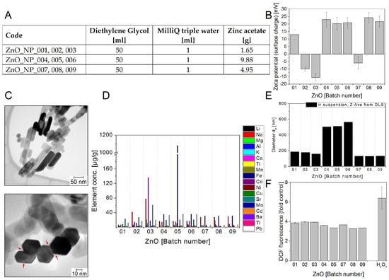 Zinc oxide NM batches ZnO NP01–09 (A) Production parameters for the different zinc oxide nanoparticles; (B) Zeta potential representing the surface charge in mV at pH ~ 6; (C) Representative TEM images. Regions marked with arrows seem to be amorphous material in between and around agglomerated single-crystalline ZnO nanorods; (D) Selected impurities present in the different flame synthesized ZnO NM batches. The mass concentrations of elements above detection limit are shown. The data represent the mean of two assays; (E) Particle diameters dP in nm: Z-Average of dP determined in aqueous suspension using DLS; (F) Potential to induce ROS. The test NMs were delivered as suspensions of 5 mg/mL in water. The graph shows the DCF fluorescence induced by the different batches at 400 µg/mL relative to a sample without NMs (control). 0.3 µM H2O2 was used as positive control. The data represent mean values of 2–6 replicates ± s.e.m obtained in one to two experiments.