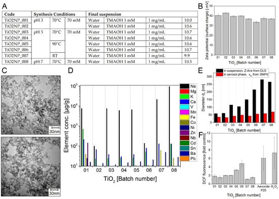 Titanium dioxide NM batches TiO2 NP01–08 (A) Production parameters for sol-gel synthesized titania nanoparticles; (B) Zeta potential representing the surface charge in –mV at pH ~10; (C) Representative TEM images (D) Selected impurities present in the different TiO2 NM batches. The mass concentrations of elements above detection limit are shown. The data represent the mean of two assays; (E) Particle diameters dP in nm: Z-Average of dP determined in aqueous suspension using DLS (black bars) and modal value xM of the number size distribution in the aerosol phase measured by SMPS (red bars); (F) The test NMs were delivered as suspensions of 1 mg/mL in water. The graph shows the DCF fluorescence induced by the different batches at 400 µg/mL relative to a sample without NMs (control). 400 µg/mL commercial TiO2 (Aeroxide®P25, Evonik, Essen, Germany) and 0.3 µM H2O2 was used as positive controls. The data represent mean values of 2 independent experiments with three replicates ± s.e.m.