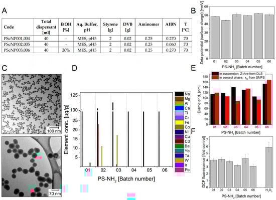 PS-NH2 nanoparticle batches PS NP01–06. (A) Production parameters for sol-gel synthesized polystyrene nanoparticles; (B) Zeta potential representing the surface charge in +mV at pH 6.1; (C) Representative TEM images (D) Selected impurities present in the different PS NM batches. The mass concentrations of elements above detection limit are shown. The data represent the mean of two assays; (E) Particle diameters dP in nm: Z-Average of dP determined in aqueous suspension using DLS (black bars) and modal value xM of the number size distribution in the aerosol phase measured by SMPS (red bars); (F) Potential to induce ROS. The test particles were delivered as suspensions of 10 mg/mL in water. The graph shows the DCF fluorescence induced by the different batches at 200 µg/mL concentration relative to a sample without NMs (control). 0.3 µM H2O2 was used as positive control. The data represent mean values of 2 independent experiments with three replicates ± s.e.m.