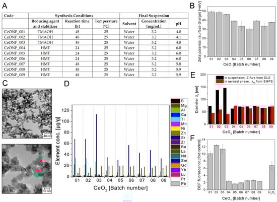 Cerium dioxide NM batches CeO2 NP01–09 (A) Production parameters for sol-gel synthesized CeO2 nanoparticles; (B) Zeta potential representing the surface charge in +mV at pH 3.8 to 6.1; (C) Representative TEM images of CeONP_008; (D) Selected impurities present in the different CeO2 NM batches. The mass concentrations of elements above detection limit are shown. The data represent the mean of two assays; (E) Particle diameters dP in nm: Z-Average of dP determined in aqueous suspension using DLS (black bars) and modal value xM of the number size distribution in the aerosol phase measured by SMPS (red bars); (F) Potential to induce ROS. The test particles were delivered as suspensions of 3.2 mg/mL in water. The graph shows the DCF fluorescence induced by the different batches at 400 µg/mL relative to a sample without NMs (control). 0.3 µM H2O2 was used as positive control. The data represent mean values of 2 independent experiments with three replicates ± s.e.m.