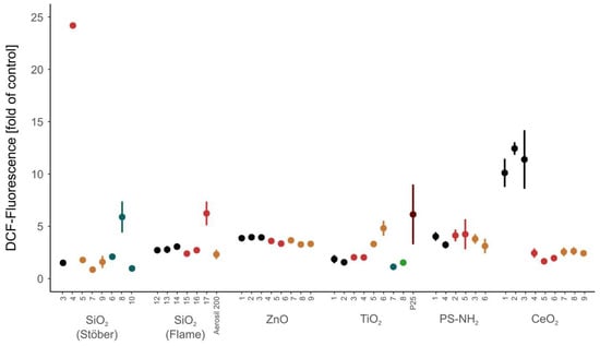 The DCF fluorescence induced by reactive oxygen species (ROS) showed a concentration-dependent increase with most NM samples. In the summary reports only the values at the highest NM concentration (400 µg/mL) are shown to provide a better overview and comparison between the different batches and 0.3 µM H2O2 was used as a positive assay control.