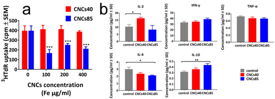 (a) Mouse spleen cell proliferation in the presence of CNCs of 40 nm and 85 nm in diameter was tested by 3HTdR incorporation assays 48 h after culture initiation. The results represent the mean of three different experiments and are expressed as cpm ± SEM; (b) Detection of cytokines in the supernatants of spleen cell cultures in the presence or not of CNCs at the concentration of 200 μg/mL. The results represent the mean of three experiments and are expressed as pg/mL ± SD. *: p < 0.01, **: p < 0.005, ***: p < 0.001 (see experimental).