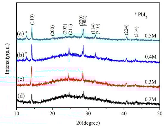 Figure 2 shows the XRD patterns of the perovskite nanowires synthesized with different PbI2 concentration of 0.5 M, 0.4 M, 0.3 M and 0.2 M. The main diffraction peaks at 2θ = 14.20°, 24.49°, 28.32°, 28.49°, 31.82° and 40.79° (Figure 2a,b) correspond to (110), (211), (004), (220), (310) and (224) planes of the tetragonal perovskite MAPbI3, which are in agreement with the references [15,27,29,30]. In addition, the weak diffraction peak at 2θ = 12.7° shown in Figure 2a,b can be indexed to the (001) plane of hexagonal PbI2 (JCPDS. No. 07-0235), indicating that a small amount of PbI2 was present in the products. Further decreasing the PbI2 concentration to 0.3 M and 0.2 M (Figure 2c,d), the products are composed of pure-phase tetragonal perovskite MAPbI3. Furthermore, the PbI2 concentration will also affect the size and density of the synthesized MAPbI3 nanowires, which is shown in Figure 3. It can be clearly seen that, with the decrease of PbI2 concentration from 0.5 M to 0.2 M, the size of MAPbI3 nanowires will increase, with the average diameter increasing from 180 nm to 850 nm and the average length increasing from several microns to dozens of microns, while the density of MAPbI3 nanowires decreases. In addition, the size distribution of the MAPbI3 nanowires become more broaden with the decrease of PbI2 concentration in the first spin-coating step.
