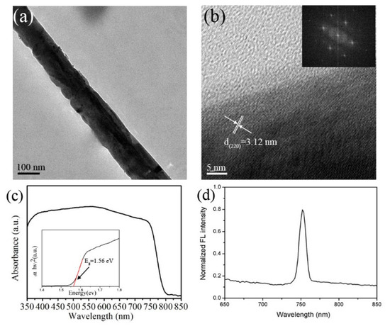 As is well known, DMF is a benign solvent, while IPA is a poor solvent for PbI2. A small amount of DMF in IPA solution will dissolve PbI2 after dropping it on PbI2 precursor films, which will form a liquid cluster containing dissolved PbI2 and MAI molecules [27]. During the secondary spin-coating stage, the rapid evaporation of solvent will lead to sudden supersaturation and form quick nucleation of perovskite MAPbI3. Furthermore, the tetragonal perovskite MAPbI3 has a tendency to form nanowires by self-assembly of particles [15], which is also confirmed in Figure S1. Along with decreasing the PbI2 concentration during the first spin-coating process, the supersaturation level of perovskite MAPbI3 in solution will also decrease, leading to fewer nucleation centers and lower density of nanowires. Due to the smaller number of nuclei, fewer monomers are exhausted at the stage of nucleation, which can be utilized to encourage each nucleus to increase in size at the stage of crystal growth, leading to a larger size of MAPbI3 nanowires. This is consistent with the SEM (Transmission electron microscopy images) images in Figure 3. Therefore, the supersaturation level of perovskite MAPbI3 in solution is a crucial factor in influencing the final morphologies of perovskite nanowires. In addition to PbI2 concentration in the first spin-coating stage, the DMF concentration and MAI concentration in IPA in the secondary spin-coating stage can also effectively influence the kinetics of nanowire growth. It’s easy to conclude that, with the decrease of DMF concentration and the increase of MAI concentration in IPA, the supersaturation level of monomer solution will increase and generate more nucleation centers, leading to higher density of perovskite MAPbI3 nanowires with smaller size, which is consistent with the SEM results in Figures S2 and S3. TEM and HRTEM images of one typical perovskite MAPbI3 nanowire are presented in Figure 4a,b. It can be seen that the perovskite nanowire has a uniform diameter, which is shown in Figure 4a. The clear crystalline lattice and identical orientation to the typical nanowire indicate that it’s a single crystal with an interplanar distance of 0.312 nm, which corresponds to the (220) plane of tetragonal perovskite MAPbI3 (Figure 4b). The FFT image inserted in Figure 4b also demonstrates that the perovskite nanowire is a single crystal. Figure 4c shows the UV-Vis absorption spectra of the perovskite MAPbI3 nanowires. This result indicates that the MAPbI3 nanowires exhibit a strong and broad range of light absorption from 350 to 800 nm, which absolutely covers the entire visible light spectrum. The band gap calculated by Tauc’s formula shown in the insert of Figure 4c is about 1.56 eV, which agrees well with the reported perovskite MAPbI3 nanowires [27]. In addition, the MAPbI3 nanowires display a strong and sharp photoluminescence peak situated at 755 nm, which is almost consistent with the reported literature [27].
