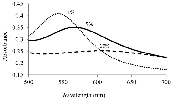Visible absorbance spectra for AuNPs produced using 1, 5, and 10% tea solutions.