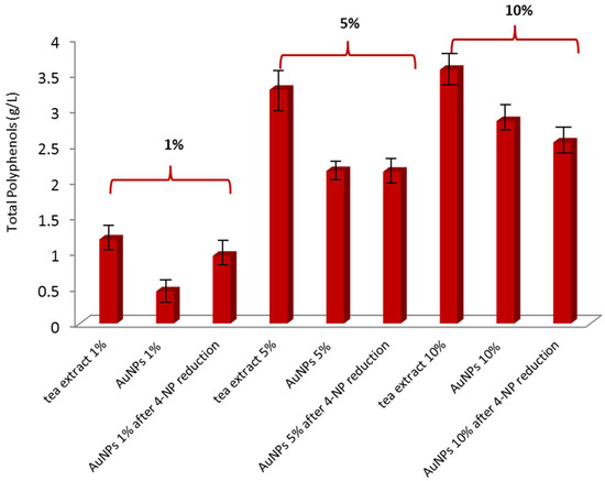 The different tea extracts (1, 5, and 10%) as well as the produced AuNPs solutions (AuNPs 1% tea, AuNPs 5% tea, and AuNPs 10% tea, respectively), before and after the catalytic reduction of 4-nitrophenol, were analyzed for their total polyphenol content (TPC) (Figure 5). The total polyphenol concentration in the prepared tea stock solutions is 1.18 g/L (for 1% w/v solution), 3.28 g/L (for 5% w/v solution), and 3.55 g/L (for 10% w/v solution), respectively, and as expected, proportional to the amount of tea leaves used to prepare those aqueous solutions (Figure 5, entries 1, 4, and 7).