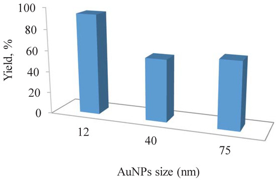 The size of metal NPs plays an important role in catalytic systems [52], and thus the application of different sizes of AuNPs in the reduction of 4-nitrophenol was studied (Figure 7). Although the catalytic activity of the AuNPs usually increases when the size of the particles decreases [52,53,54], an optimal particle size for a particular catalytic system can occur [55,56].